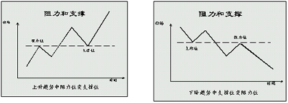 當(dāng)外匯市場(chǎng)中賣方力量超出買方力量,價(jià)格向上勢(shì)頭受阻,調(diào)頭向下,形成一個(gè)波峰,這一價(jià)位稱為阻力位。當(dāng)買方力量大于賣方力量,價(jià)格受到支持向上反彈,形成一個(gè)波谷,這一價(jià)位稱為支撐位。在上升市中,之前的最高價(jià)往往會(huì)成為阻力位。在下跌市中,之前的最低價(jià)往往會(huì)成為支撐位。